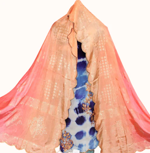 Blue Crepe Tie Dye Shirt With Plan Bottom With Double Dye Tabbi Silk Dupatta and Machine and Tila Work on Suit and Stencil Work on Dupatta Finished With Cut Work.