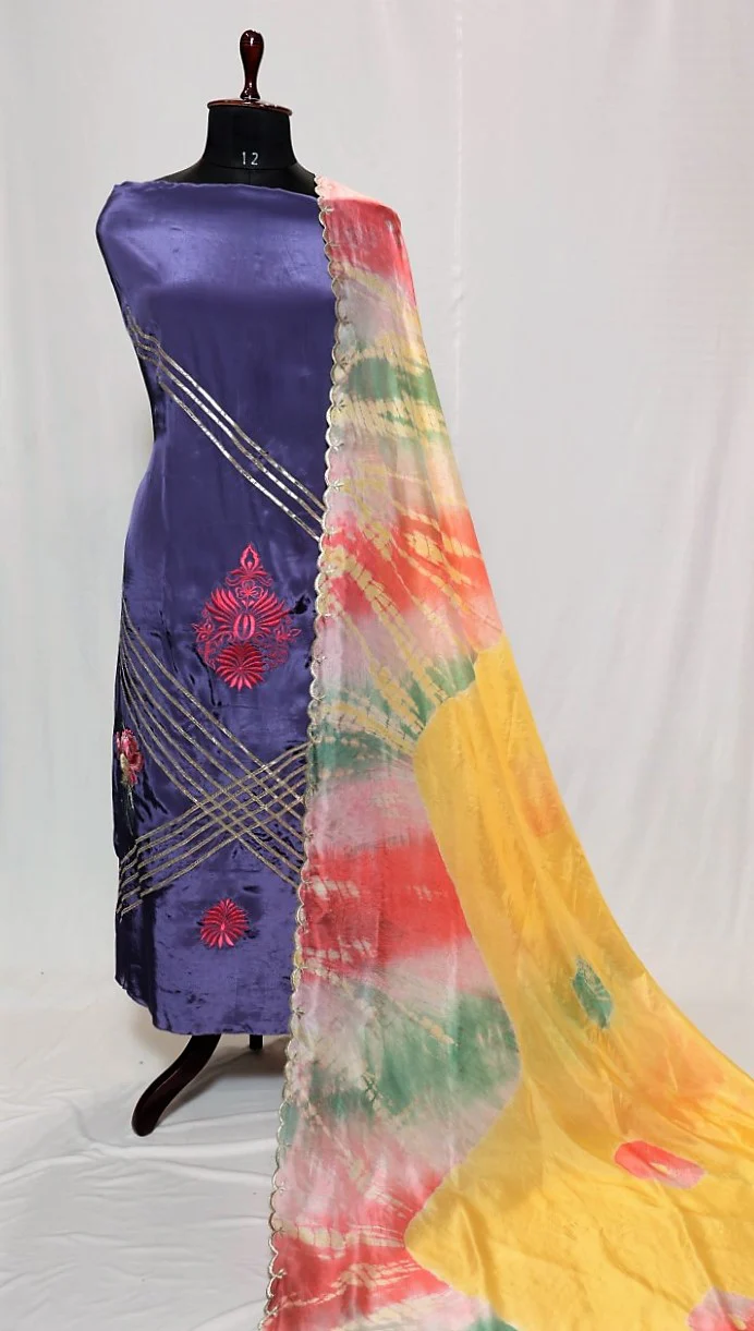 Blueish Purple Crepe Full Suit With Tabbi Silk Tie Dye Dupatta and Machine, Thread and Gota Work on Suit and Dupatta Finished With Cut Work.