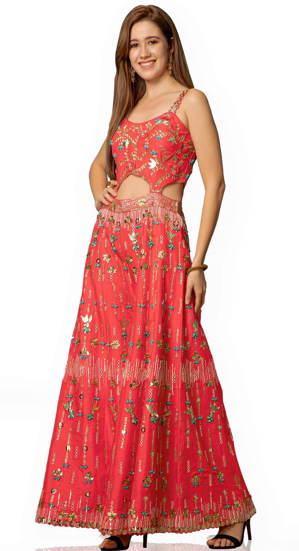 Peach Tie Dye Crepe Shirt With Plan Crepe Bottom With Peach Organza Lines Dupatta and Machine, Tila and Gota Work on Shirt and Bottom and Tila and Gota Work on Dupatta Finished With Lace.