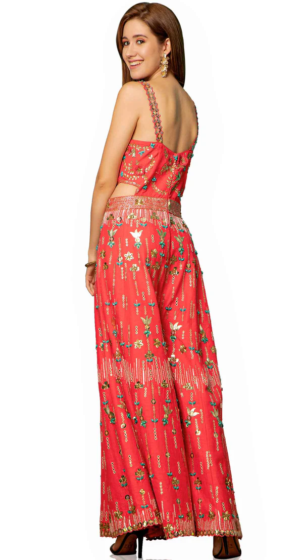 Sharara suit in dusky brinjal Colour with thread kasheeda and aari embroidery and done up on dupion silk fabric with net dupatta.