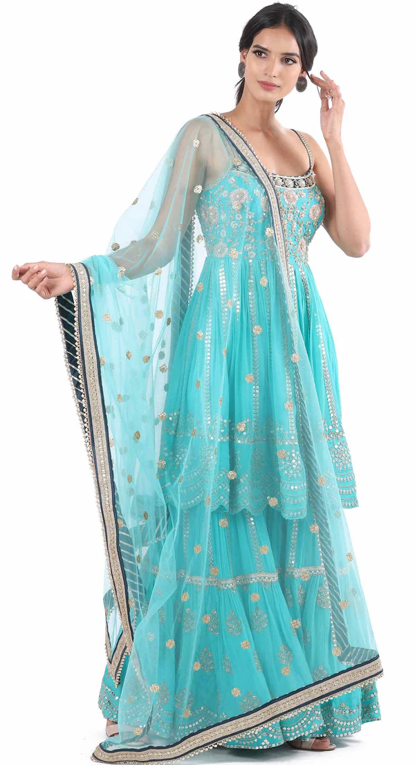 Fully attached Jump Suit in faux Silk with metal rose work and thread embroidery mixed to give a very stylish and chic look.
