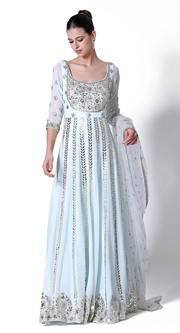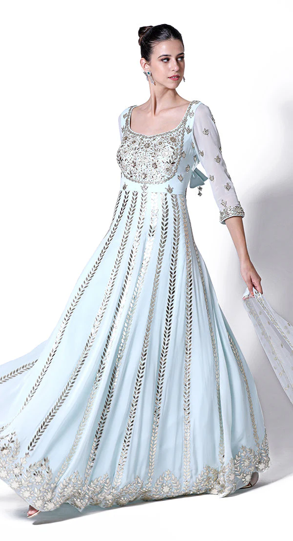 Fully attached Jump Suit in faux Silk with metal rose work and thread embroidery mixed to give a very stylish and chic look.