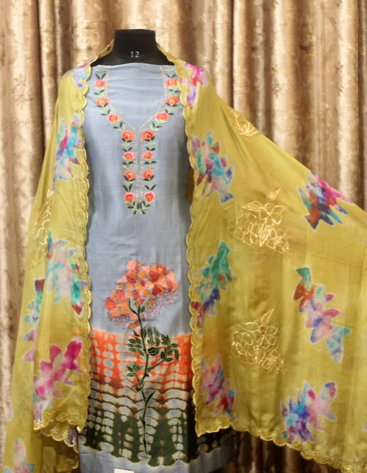 Greay Crepe Tie Dye Shirt With Plan Bottom With Tabbi Silk Tie Dye Dupatta and Machine, Thread and Tila Work on Suit and Gota Work on Dupatta Finished With Cut Work.