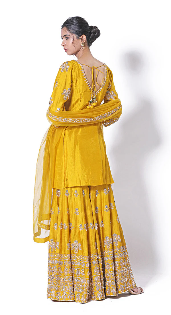 Sharara suit in mustard colour with thread kasheeda and aari embroidery and done up on dupion silk fabric with net dupatta.