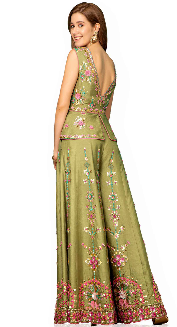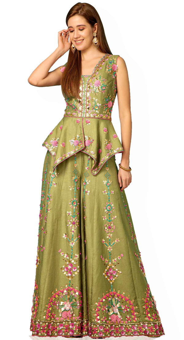 Sharara suit in Peach colour with thread kasheeda and aari embroidery and done up on dupion silk fabric with net dupatta.
