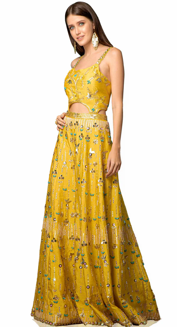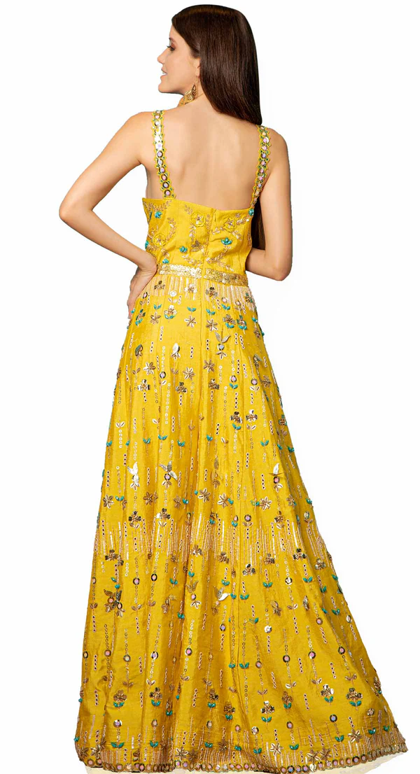 This Beautiful jump suit in raw silk and in lime-mustard colour is embellished with very trendy and modern hand sequin embroidery.