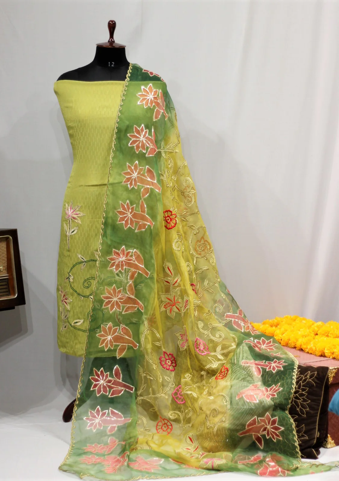 Parrot Green Self Crepe Full Suit With Organza Tie Dye Dupatta and Machine, Thread and Gota Work on Suit and Thread, Tila and Gota Work on Dupatta Finished With Cut Work.