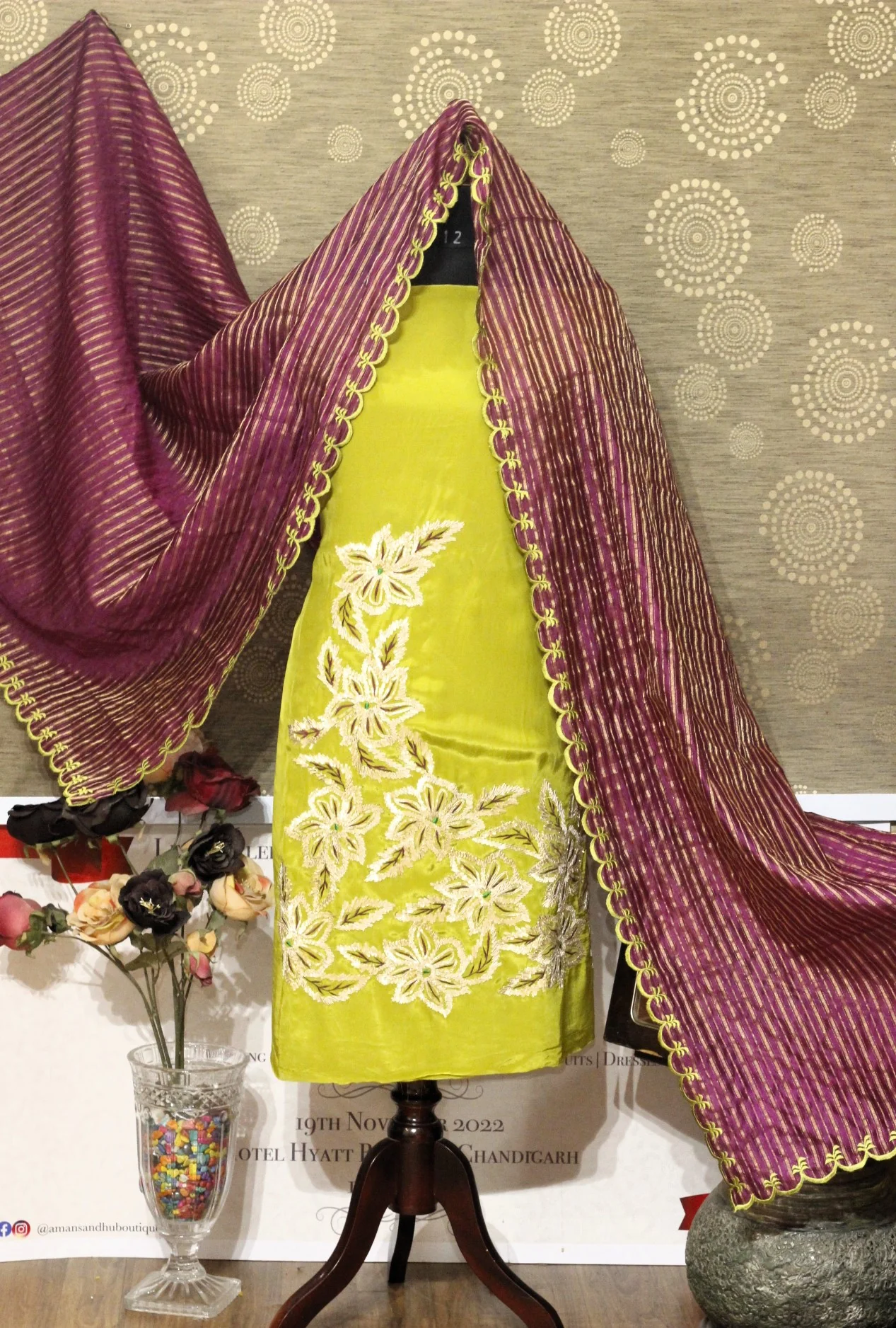 Parrot Green Crepe Full Suit With Wine Lines Tissue Organza Dupatta and Machine, Thread and Gota Work on Suit and Dupatta Finished With Cut Work.