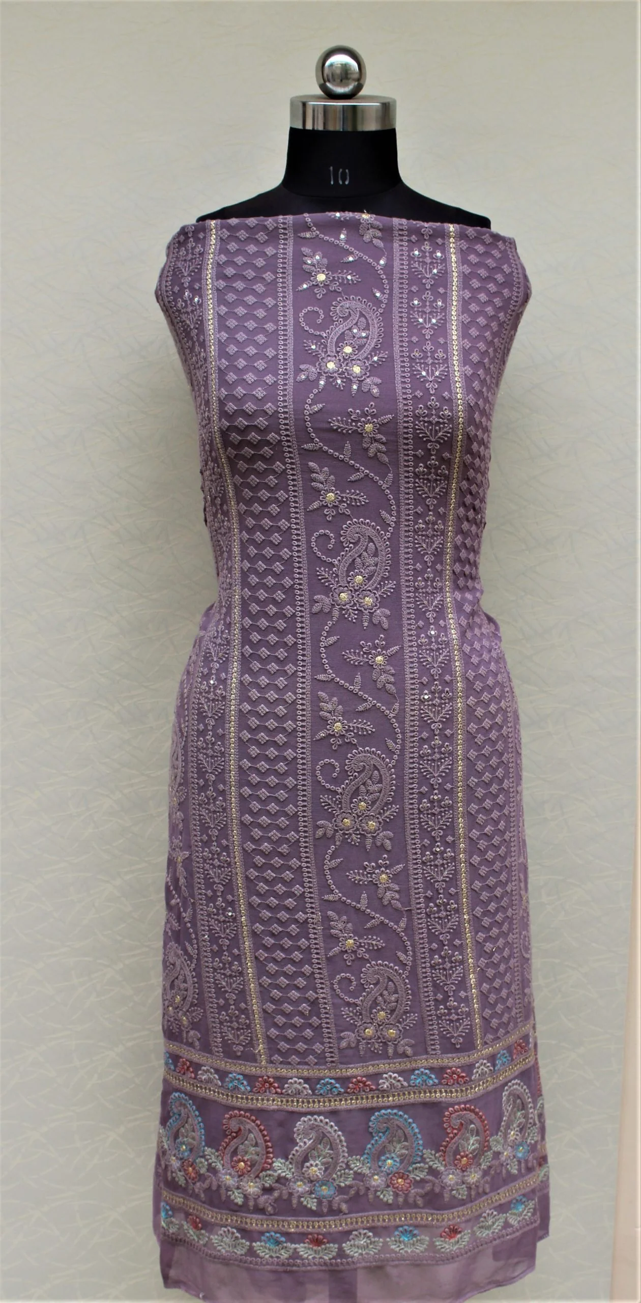 Purplish Greay Georgette Shirt With Crepe Bottom With Brush Painting Chinon Chiffon Dupatta and Machine, Thread and Tila Work on Suit and Tila Work on Dupatta Finished With Cut Work.