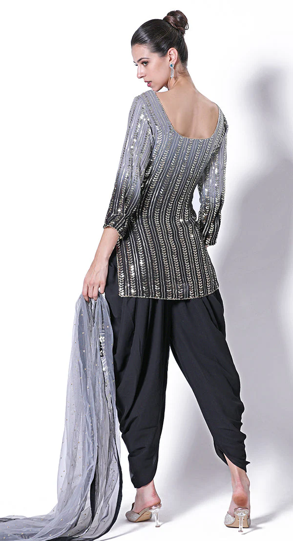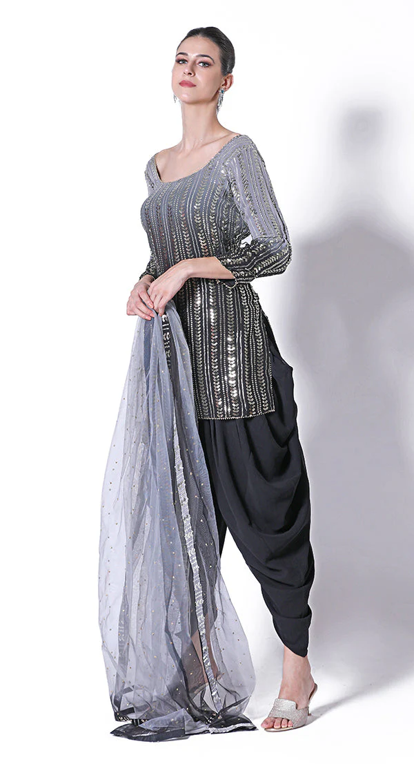 Fully attached Jump Suit in faux Silk with metal rose work and thread embroidery mixed to give a very stylish and chic look.