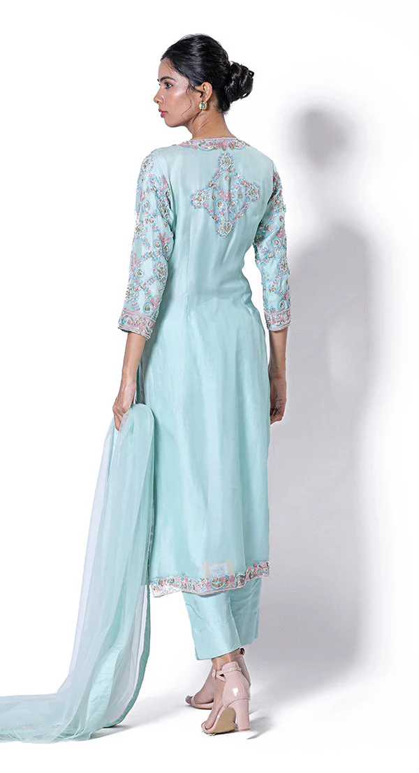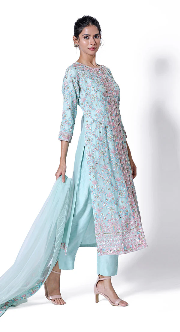 Sharara suit in mustard colour with thread kasheeda and aari embroidery and done up on dupion silk fabric with net dupatta.