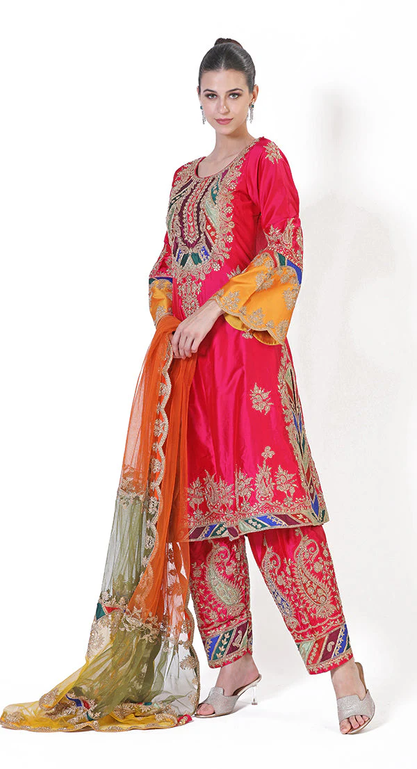 This Beautiful jump suit in raw silk and in lime-mustard colour is embellished with very trendy and modern hand sequin embroidery.