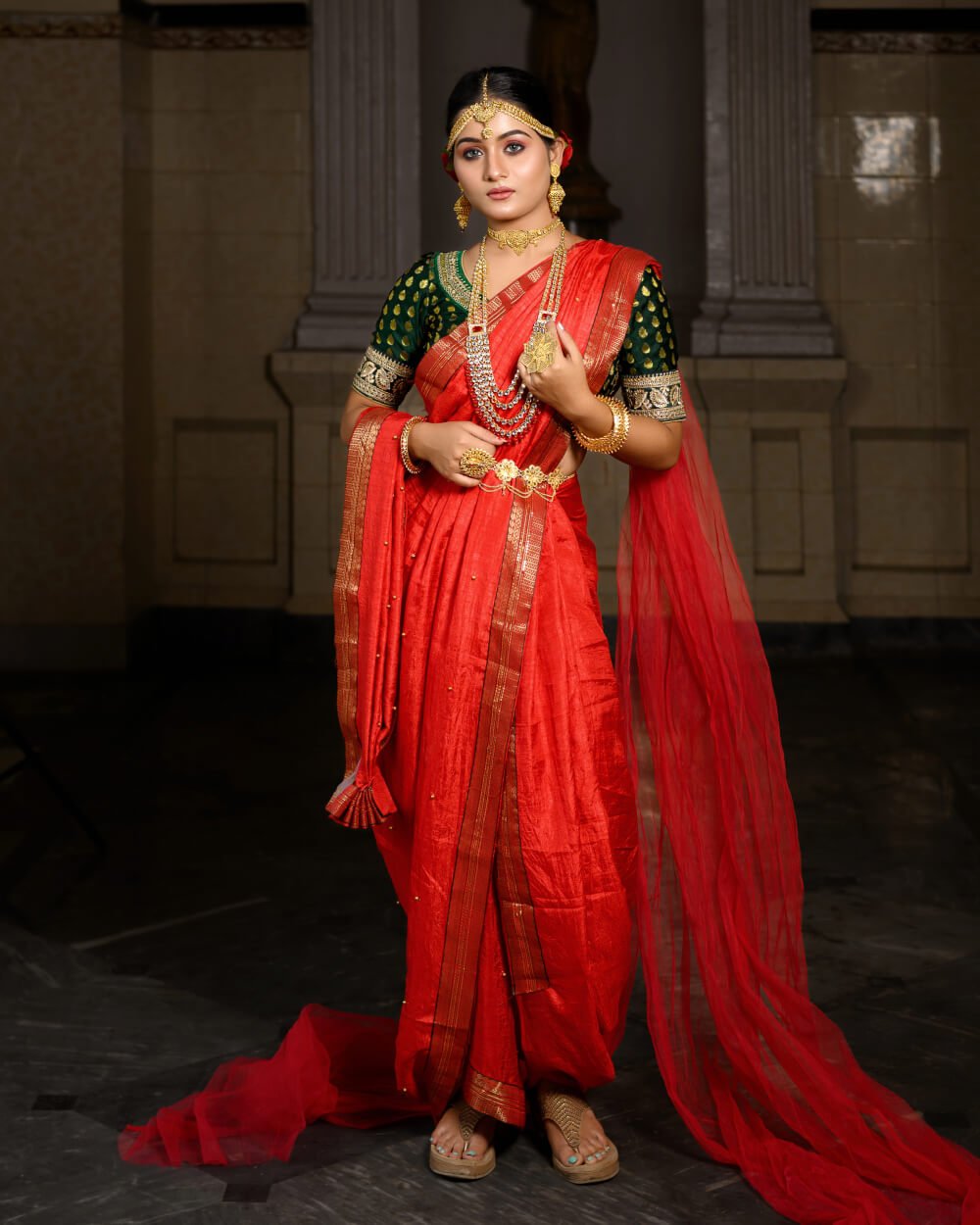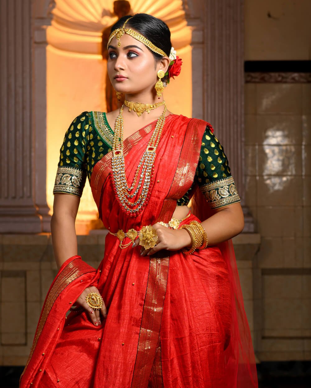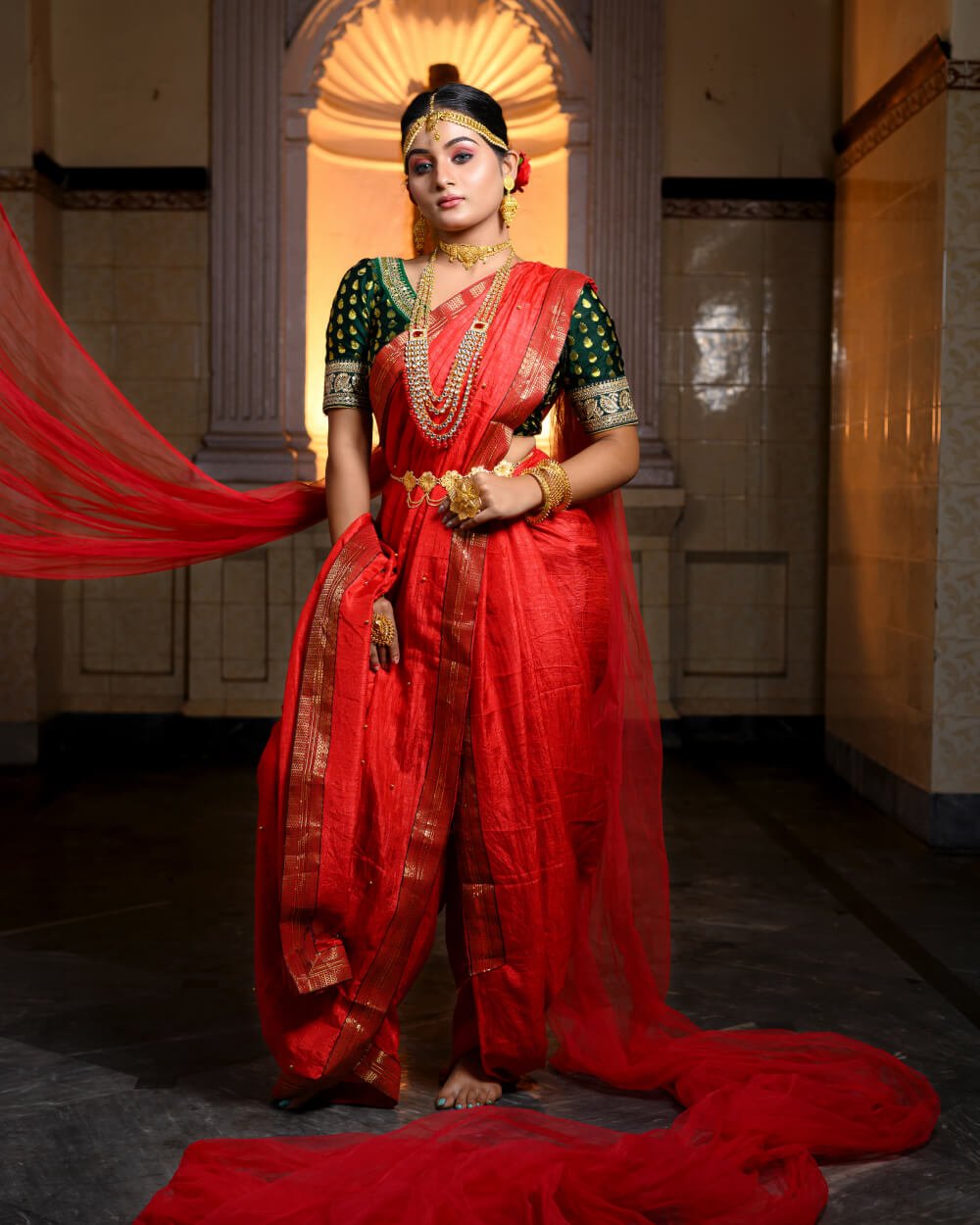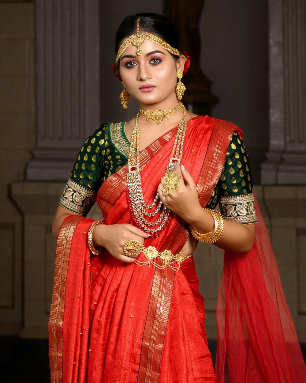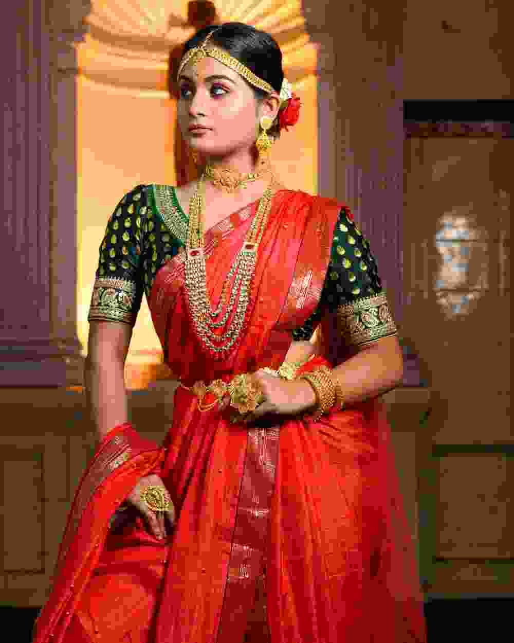 Step into a world of tradition and grandeur with this stunning bridal saree, meticulously designed for the modern bride who cherishes cultural heritage. Crafted from premium fabric, the saree boasts intricate zari embroidery, delicate handwoven patterns, and a regal color palette that exudes sophistication. The fine craftsmanship and luxurious drape ensure an effortlessly graceful look, making it an ideal choice for weddings and festive occasions. Pair it with traditional jewelry to complete your ethereal bridal ensemble and leave a lasting impression on your special day.