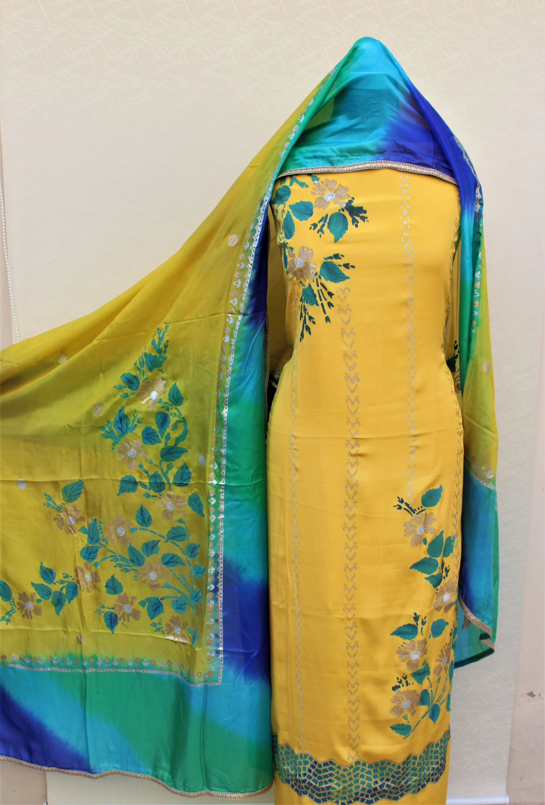 Yellow Crepe Full Suit With Tabbi Silk Tie Dye Dupatta and Stencil Work on Suit and Stencil Work on Dupatta